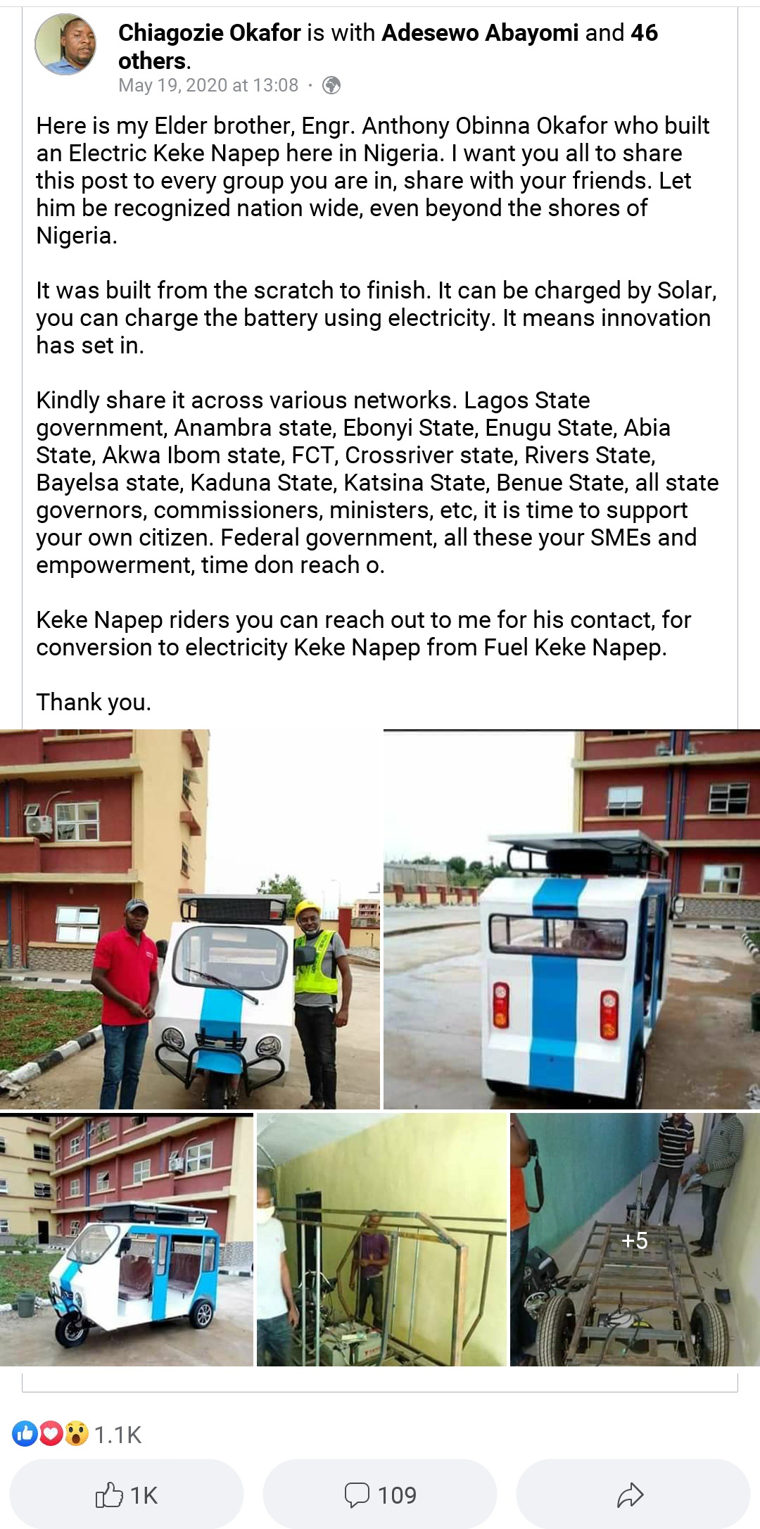 His junior brother brought the invention online so people can see his brother's new invention. He wrote on Facebook "Here is my Elder brother, Engr. Anthony Obinna Okafor who built an Electric Keke Napep here in Nigeria. I want you all to share this post to every group you are in, share with your friends. Let him be recognized nation wide, even beyond the shores of Nigeria.